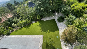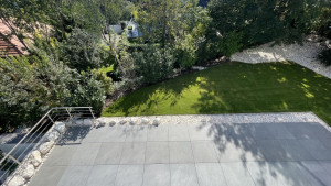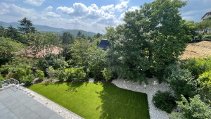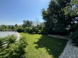 Parkosított kert nagy fákkal, örökzöldekkel, teljes intimitást biztosítva