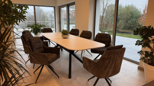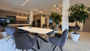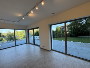Nagy méretű nappali–étkező, közvetlen kertkapcsolattal