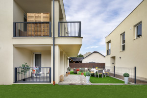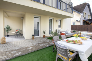 A 45 m²-es saját kert és a 15,5 m²-es részben fedett terasz a kertes házak kényelmét nyújtja, de a társasház minden előnyével.
