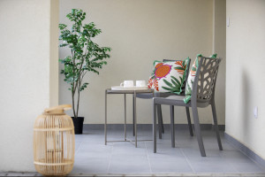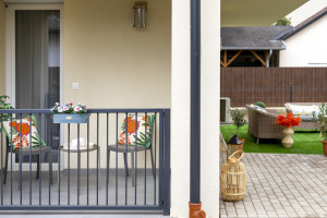 A kertkapcsolatos nappaliból kilépve a terasz tökéletes helyszíne lehet reggeli kávénak, családi ebédnek vagy esti beszélgetéseknek – ez a lakás a pihenésre is időt ad, a tervezés során fő szempont volt a kényelmes és időkímélő fenntartás.