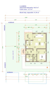 Az ingatlanok kialakítása megegyezik, méretük 62 m2. Felosztásuk a következő: