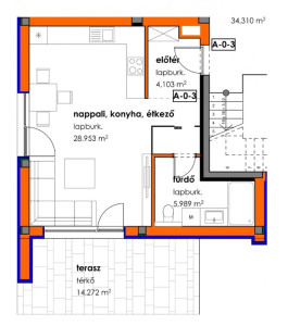 A belső tér beosztása egy nappali, konyha + étkező egy légtérben, előtér, zuhanyzós, WC-s fürdőszoba, kívül egy 14 m2 és egy 9 m2 terasz található.