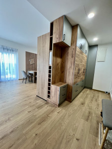 A lakáshoz egy közös tároló is tartozik, illetve egy félig fedett gépkocsibeálló, aminek megvásárlása 5 millió forintért kötelező.