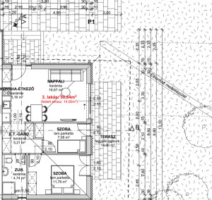 Beosztását tekintve egy amerikai konyhás nappali, egy hálószoba, egy dolgozó szoba, tágas előtér, WC-s, zuhanyzós fürdőszoba, és egy terasz került benne kialakításra.